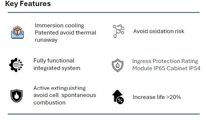 The +C containerized energy storage system by ETICA embodies a cutting-edge approach to energy storage solutions. With a storage capacity equivalent to a standard 40-foot container in half the size, its modular design not only optimizes project timeline and budget but also maximizes efficiency. Featuring advanced immersion cooling battery technology, state-of-the-art fire-suppression mechanisms, and an in-house Master Battery Management Unit (MBMU), the +C system sets a new standard for safety and intelligence in the realm of energy storage solutions.